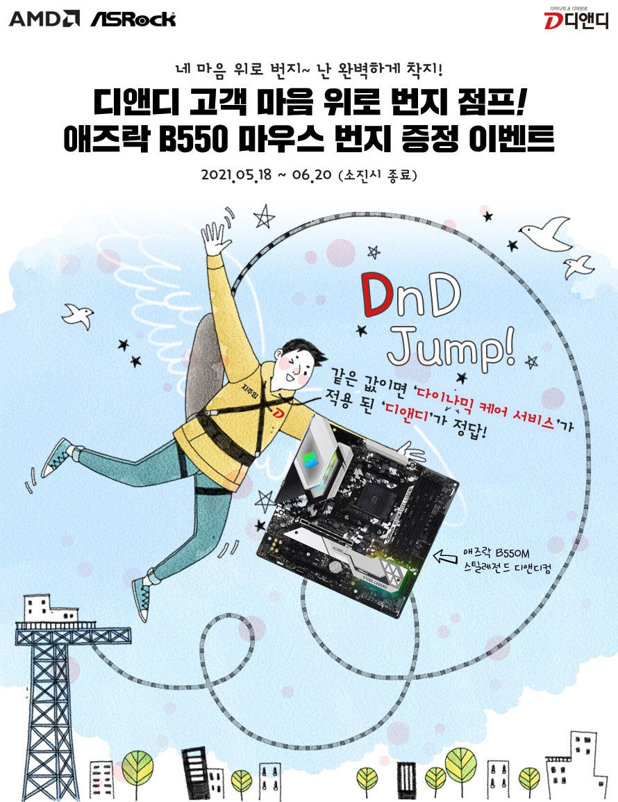 5월 18일부터 6월 20일(소진시 종료)까지 진행되는 ‘디앤디 고객 마음 위로 번지 점프!’ 이벤트는 애즈락 B550M 스틸레전드, B550M PRO4, B550M 팬텀게이밍4 메인보드 구매 시 좀 더 편안한 PC 사용을 도와주는 마우스 번지를 1:1로 증정하는 이벤트이다.